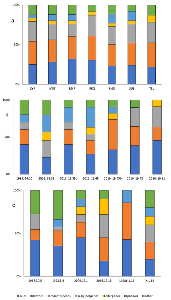 “Aroma” compound classes detected by DART-MS (identified by mass only) for (a) the replica perfumes, (b) the residues from the double-barreled unguentaria, and (c) the single-barreled unguentaria residues.