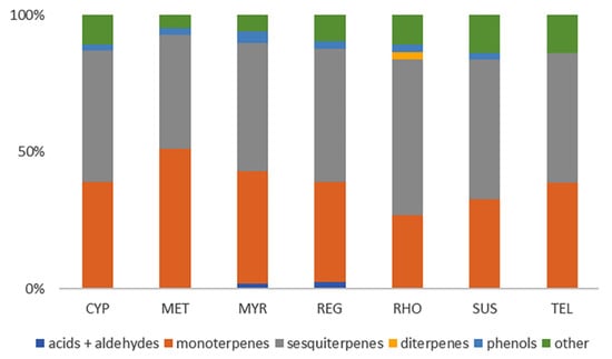 A total of 94 individual compounds were identified by their EI mass spectra in the headspace SPME of the replica perfumes (for a full list of compounds, see Table S1 and for chromatograms Figure S3, both in the Supplementary Material). This wide range of different compounds was characteristic of the aroma materials, nearly all of which were terpenes and terpenoids, as shown in Figure 4. Many of the monoterpenes, such as α-pinene, camphor, sabinene, linalool oxide, 1-terpinen-4-ol, terpineol acetate and fenchyl acetate, were non-diagnostic, occurring in all of the replica perfumes. Three sesquiterpenes—bourbonene, elemene, and humulene—were also found in all of the replica perfumes. Other compounds were specific to the aroma components used in the preparation of the replicas, such as the identification of rose oxide in the rhodinum replica perfume scented with roses, thujone in the cyprinum that was scented with wormwood oil prepared from Artemesia spp., and myrtyl acetate in the myrtum laurum prepared from myrtle (Myrtus communis L.). Irone was identified in the susinum replica perfume, as would be expected in a lily extract, but was also present in cyprinum and telinum, both of which contained calamus (Acorus calamus L.). Interestingly, no benzaldehyde was detected by HS-SPME-GC-MS in the metopium replica perfume, scented with bitter almonds. The complexity and long ingredient list for regale unguentum did not suggest any specific compounds of interest that should be expected in the HS-SPME-GC-MS.