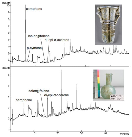 Chromatograms from HS-SPME-GC-MS of two of the unguentaria residues: top, 2016.19.51 (double-barreled); bottom, 2009.12.1 (single-barreled). Additional chromatograms are provided in the Supplementary Materials.