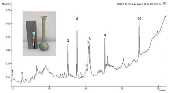 Chromatogram for the extracted and TMS-derivatized residue from 1983.1.16, a single-barreled unguentarium.