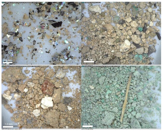 Visual examination of the residues under the digital microscope revealed the presence of what may be pigments or other coloring materials, consistent with the addition of colorants as described for the replica perfumes. Figure 7 shows the material provided for analysis from four of the unguentaria, portions of which were selected for SEM-EDS. The residue from 1967.30.4, a single-barreled unguentarium, shown in Figure 7a, is mostly glassy flakes, probably from the vessel itself. The residues from the double-barreled unguentaria (Figure 7b–d) are more varied, showing fragments of colored materials. In the case of 2016.19.48, the residue was nearly all made up of pigmented material. Further characterization of these materials was carried out with SEM-EDS.