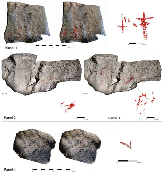 | Panel 1 | P1-M1: Semi-schematic anthropomorphic figure with broad strokes. Cruciform shape with extended arms and legs in an inverted “V”. The lower half is less distinct, showing a phallic symbol and an oblique stroke that may represent a weapon. 25 × 25 cm. P1-M2: Highly schematic anthropomorphic figure, resembling the cruciform type. 30 × 20 cm. P1-M3 to P1-M6: Four smaller vertical motifs. | ![]() |