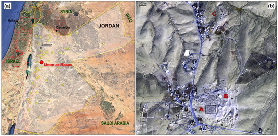 (a) Site location base map from Google Earth © (yellow dots highlight main cities and yellow line indicate the border of Jordan) and (b) detail of the archaeological area (Pléiades Neo satellite image taken on 25 January 2022, acquired from Sysdeco Company): castrum (A); Byzantine–Umayyad village (B); Stylite tower complex (C).