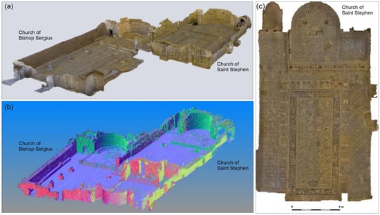 Byzantine churches: (a) 3D model of the two Churches in their actual spatial arrangement; (b) qualitative inclination map of walls where the colors indicate the direction of the surfaces; (c) High-resolution orthographic view of Saint Stephen’s mosaic floor obtained by integration of photogrammetric and laser scanning techniques. Modified by [50], copyright by the authors.