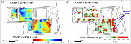 Byzantine churches: (a) Model of altitude variation in the floor of the churches; (b) Georadar slices related to the depth window of 0.5–0.7 m overlapped on the map of the churches: the blue arrows indicate the location of probable tanks, while the pink arrows highlight probable buried archaeological structures. Modified by [50], copyright by the authors.