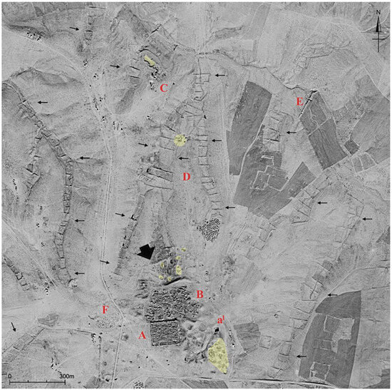 Umm ar-Rasas. Hexagon KH-9 space photo taken on 1974/12/01, ground resolution: 1.20–0.60 m (acquired from United States Geological Survey). Featured: (A) Roman castrum; (a1) hydraulic reserve; (B) Byzantine and Umayyad settlement; (C) Stylite tower complex; (D) System of irrigated plots (channels and dams); (E) the dam; (F) the Byzantine cemetery. Quarries and stone material extraction sites are highlighted in yellow, while arrows indicate hydraulic channeling systems. Finally, the large black arrow indicates the northern limit of the settlement.