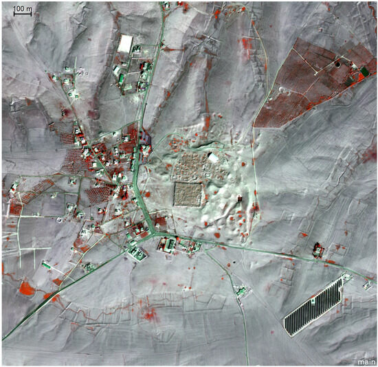 Umm ar-Rasas. False color composite Pléiades Neo image taken on 25 January 2022 (processed in eCognition Developer). The color red is employed to denote areas of elevated humidity.
