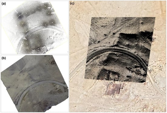 In this work, the phase-difference laser scanner FARO 3D X330 (Faro Company, Lake Mary, FL, USA) was utilized for data acquisition with the aim to detect surface inhomogeneity. Sixteen scans were performed with a resolution of one point every 7 mm obtaining a cloud of about 70,452,142 points. The volume of data generated was processed in accordance with generally accepted methods for point cloud maintenance and restoration across many application domains [68]. JRC 3D Reconstructor 4.4.1 (Brescia, Italy) and Cloud Compare 2.13.2 (Paris, France) software were used for point cloud conversion and subsampling with uniform point spacing of 1 cm, obtaining a total of 65,687,769 points with a resolution of 6 mm, for Digital Elevation Model (DEM) and orthophoto generation (Figure 7). All data were imported in a QGIS Geographic Information System (QGIS Development Team (2024), Open Source Geospatial Foundation Project, http://qgis.osgeo.org, accessed on 15 December 2024).