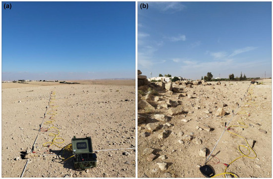 Data acquisition using the multi-channel resistivity meter M.A.E. ET300 in (a) Area 1 and (b) Area 2.