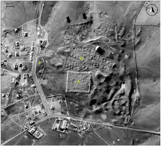 Umm ar-Rasas. The result of Pléiades Neo processing combines the panchromatic band (PAN) with the Normalized Difference Water Index (NDWI) and the Near-Infrared (NIR) band. (A) Roman castrum; (B) Byzantine and Umayyad settlement; (F) remains of Byzanthine cemetery. Black arrows indicate traces of the north-western boundary of the Byzantine and Umayyad settlement.
