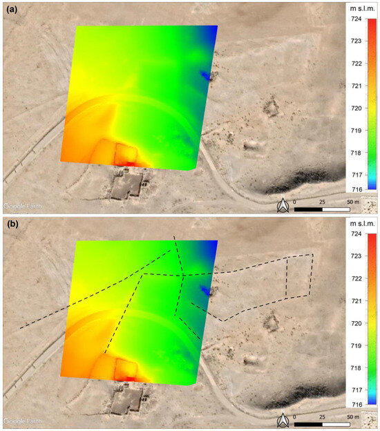 Google EarthTM satellite image of the investigated area with (a) the overlapping of the DEM obtained through the laser scanner and (b) the superposition of the traces with dotted lines.