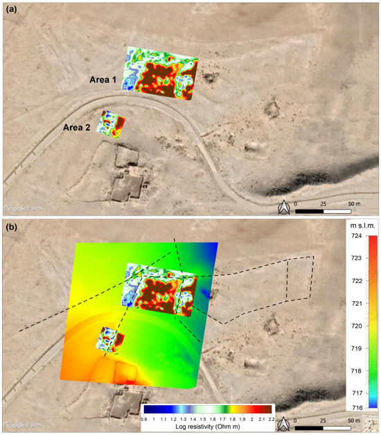 Two areas were investigated, one located to the north to the road that joins the visitor center to the complex of S. Stefano Churches (Area 1) and another to the south close to the remains of one of the most NNO dwellings in the ancient settlement (Area 2) (Figure 8a). Areas 1 and 2 were surveyed using 85 and 14 lines of investigation, respectively, with equal spacing of 1.5 m. In each line, 16 electrodes were located at a mutual distance of 1 m.