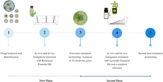 The present study addresses the disinfection of an active fungal colonization on a historical paper-based document, which is the subject of the case study, through the use of essential oils by exposure to the vapor phase without direct contact with the artifact. The study is divided into two phases (Figure 1): the first phase involved the isolation and identification of fungal species and the evaluation of the biocidal activity of rosemary essential oil both in vitro and in vivo. One month after the treatment, during microbiological monitoring, a new sampling was carried out to assess the long-term effects of the treatment. The second phase involved the identification of a single new colonizer, belonging to the Trichoderma genus. This latter, which proved to be resistant to the activity of rosemary essential oil at the used dose level, underwent new tests to assess its sensitivity to lavender essential oil and a standard reference biocide. This phase also included an in vitro and an application study, as well as post-treatment monitoring to evaluate the durability of the second treatment over time.