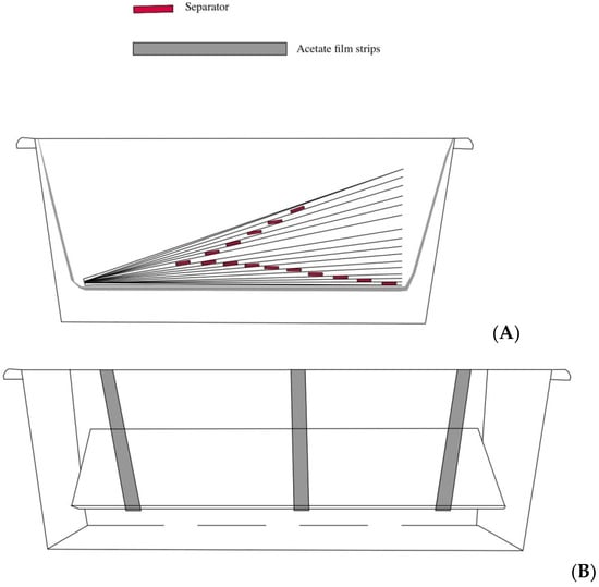 Once the effective concentration (v/v) of essential oil to be used was determined, the experiment was performed in vivo by creating a “clean chamber” using a PET container (Figure 3). The clean chamber has a total volume of 0.06 m3 (75 cm × 40 cm × 20 cm). The journal was suspended inside the chamber using acetate film strips as supports (Figure 3A). Dividers in foam rubber (approximately 0.5 cm high) were inserted between the pages to separate each sheet and allow for uniform fumigation of all the surfaces (Figure 3B). The period of exposure to the rosemary oil vapor phase was 4 weeks. The pure oil was poured at the base of the clean chamber, beneath the suspended journal, ensuring no direct contact. Each concentration tested in vitro represents a percentage concentration relative to the total volume to be treated (20 μL = 0.2%, 40 μL = 0.4%, 60 μL = 0.6%, 80 μL = 0.8%, 100 μL = 1%). The concentration found to be the most effective in the in vitro assay (1%) was selected for the in vivo experiment: based on the volume of the chamber, a total of 60 mL of essential oil was used.
