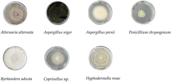 Following the isolation process, seven fungi were identified, and their sequences were submitted to GenBank with their accession numbers: Alternaria alternata (PP989965-PP989966); Aspergillus niger (PP989960-PP989961); Aspergillus persii (PP989947-PP989948); Bjerkandera adusta (PP989945-PP989946); Coprinellus sp. (PP989939-PP989940); Hyphodermella rosae (PP989943-PP989944); and Penicillium chrysogenum (PP989950-PP989951) (Figure 4).