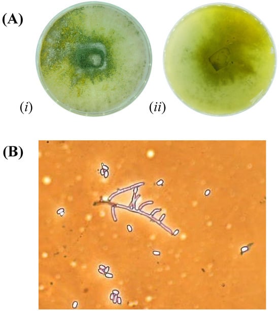 (A) Top (i) and bottom (ii) views of Trichoderma longibrachiatum in PDA Petri plates (90 mm). (B) Images of the fruiting bodies and conidia produced by 10–14-day-old fungal cultures on PDA with optical microscope (Olympus BH-2).