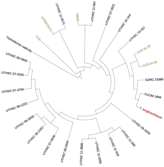 Trichoderma longibrachiatum phylogenetic tree obtained using ITS and TEF1 sequences from NCBI database. DNA sequences were aligned using the multiple sequence alignment program ClustalW. Trichoderma vadicola was used as out-group taxon. Strain under study is labeled in red, and those isolated from soil in green. The others have been isolated from human sources (black).