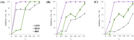 Results for growth inhibition percentage of Tricoderma longibrachiatum against rosemary essential oil (REO), lavender essential oil (LEO) and Benzalkonium chloride-based biocide (BIO). Values (±SD) are shown by monitoring after (A) 3 days, (B) 6 days, and (C) 9 days.