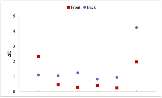 The graph shows the results of the colorimetric analysis of six measurement points on the front and back cover of the journal, expressed as total color variation (ΔE) obtained by comparing the values measured before and after the fumigation treatments (Figure 9). The measurements show mostly ΔE values in the range between 0 and 2.5, which are considered negligible since they are barely noticeable [21]. Nonetheless, even a slight chromatic variation may be considered an acceptable compromise when weighed against the colorimetric alterations resulting from microbiological degradation.