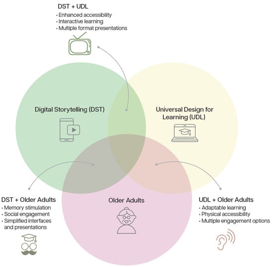 This section illustrates the intersection of digital storytelling (DST), universal design for learning (UDL), and their applications for older adults in museum contexts as presented in Figure 1. It examines the relationships between DST and older adults (Section 2.1), UDL and older adults (Section 2.2), and UDL and DST (Section 2.3).