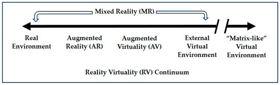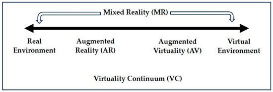 According to Milgram and Kishino [22], mixed-reality (MR) environments involve merging real and virtual worlds along continuous virtualization (VC) and connecting real environments with virtual ones, either as augmented reality or augmented virtuality (Figure 1).