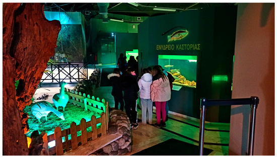 The educational activity titled “Exploring the Aquarium of Kastoria” is conducted in the indoor spaces of the Kastoria Aquarium (Figure 3), which hosts a wide range of fish and other organisms, such as crustaceans, amphibians, and reptiles. These species survive and reproduce in the lakes and rivers of Greece and the Balkans, encompassing indigenous, endemic, and non-native forms. The Aquarium of Kastoria was inaugurated in 2012 by the Ecumenical Patriarch Bartholomew and is co-located with the Environment and Sustainability Education Centre of Kastoria.