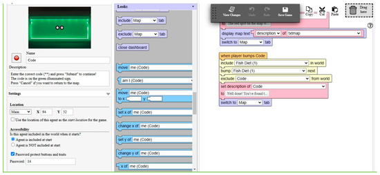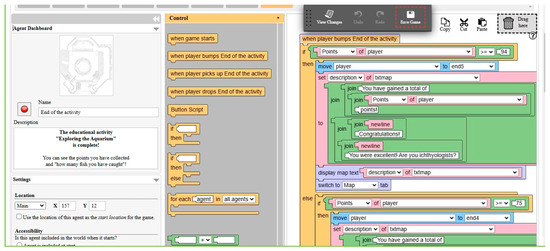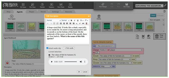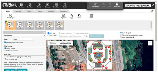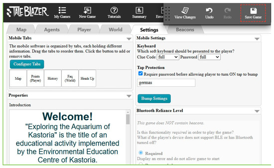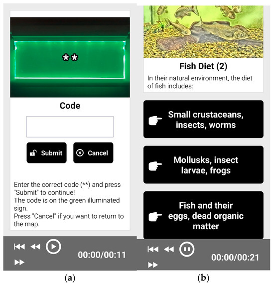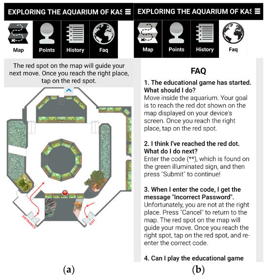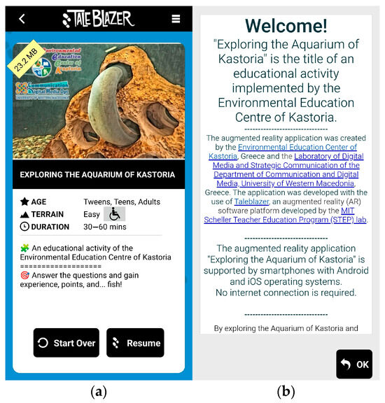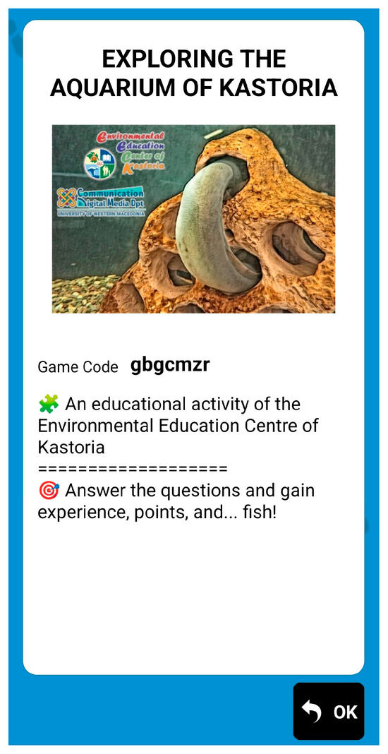 For the development of the augmented-reality digital application, TaleBlazer, an open-source web platform, accessible at http://taleblazer.org/ (accessed on 1 March 2025), was utilized. TaleBlazer was developed by the Scheller Teacher Education Program (STEP) Laboratory of the Massachusetts Institute of Technology (MIT) and allows the design and development of augmented- or mixed-reality applications [56,57] for outdoor and indoor spaces (e.g., in museums, aquariums, botanical gardens, open-air museums, natural ecosystems, or city environments). The utilization of digital applications developed in TaleBlazer requires the use of wireless mobile devices (smartphones and tablets) with an Android operating system (version 10.0 or later) or iOS (version 12.0 or later). For indoor spaces where the GPS signal is weak or totally absent, Taleblazer provides three alternative techniques for developing applications: Password-Protected Agents, Clue Codes, and iBeacons. The Password-Protected Agents solution was preferred, which allowed players to search in a predetermined order for passwords placed in specific locations inside the aquarium.