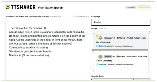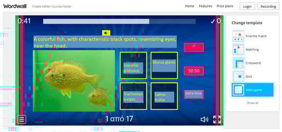 With the help of Adobe Photoshop, a custom map was created, which depicts the floor plan of the interior of the aquarium, as well as the necessary photos, buttons, banners, etc. The final design of the navigation menu of the digital application included a navigation map, user assistance (FAQ), recording of navigational history, and user score. The application’s programming took place in Taleblazer’s visual block-based programming environment. For the reflection and evaluation activity, entitled “Fish and Organisms of the Aquarium of Kastoria”, a timed multiple-choice quiz, with gamification features (i.e., lives and bonuses) was created, which was developed using the Wordwall online platform: https://wordwall.net/ (accessed on 1 March 2025).