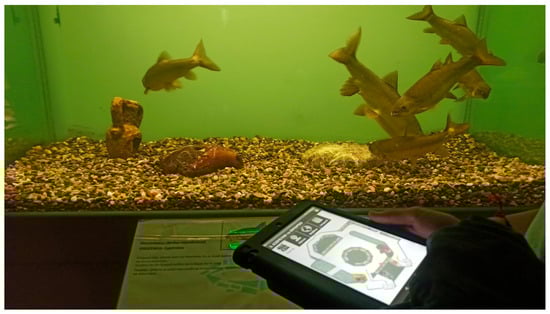 Acknowledging the potential offered by new technologies, particularly the use of wireless portable devices to promote active and self-regulated learning, and aiming to enrich educational activities with additional learning experiences [17,54], students’ exploration of the Aquarium of Kastoria is guided by the utilization of an interactive digital augmented-reality application installed on tablets of the Environment and Sustainability Education Centre of Kastoria.