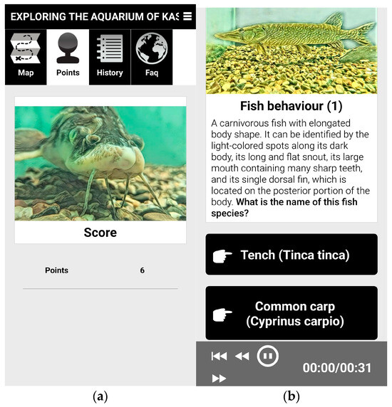 In the last stage, the application “Exploring the Aquarium of Kastoria” was executed and tested by a sample of pilot users (members of the pedagogical team of E.S.E.C. Kastoria and staff of the aquarium of Kastoria) in order to obtain evaluation and feedback related to its content, design, and functionality. The pilot users’ comments were taken into account, and, where appropriate, necessary changes and corrections were made (e.g., the possibility for participants to skip some questions negligently was excluded, and the application does not move to the next stage if participants do not answer). Considering the architecture and the particularities of the aquarium’s interior space, the screen’s brightness levels, the font size of the text, and the sound levels were adjusted accordingly. At the same time, different versions of the digital application were created with different starting points of the predetermined route in order to avoid, as much as possible, the overcrowding of student groups at the same points/stops.