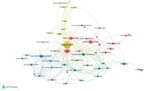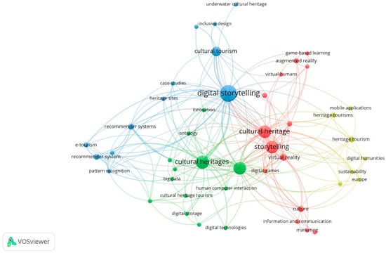Then, the research employed VOSviewer software version 1.6.20, establishing a minimum threshold of three appearances for keyword recognition. VOSviewer is bibliometric analysis software that visualizes relationships and patterns within academic literature through network mapping. It processes large datasets of scholarly publications to identify research clusters, trends, and connections, enabling systematic analysis of academic literature landscapes [15]. This analytical approach revealed four distinct clusters, represented through color-coded visualization (one color for each cluster grouped by keywords with the same meaning) in Figure 1, Figure 2, Figure 3, Figure 4 and Figure 5 and Table 2. The methodology adopted a theory-based review framework [16] by grouping all literature into content analysis, specifically examining technological applications in cultural tourism contexts.