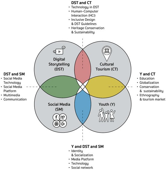 This review aims to develop an integrated digital storytelling for social media (IDSM) framework that enhances youth engagement in cultural tourism through social media platforms by augmenting traditional narrative guidelines with elements of contemporary digital engagement. However, as mentioned, there are no digital storytelling guidelines that have been updated to include social media elements. Therefore, this review proposes new elements through a comprehensive analysis of four interrelated domains: digital storytelling in cultural tourism, digital storytelling and social media, youth engagement in cultural tourism, and youth interaction with digital storytelling through social media platforms.