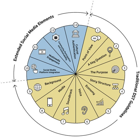 Salpeter’s approach [42] emphasized project-based development and collaborative storytelling processes. These early frameworks established crucial methodological foundations for subsequent theoretical development. However, Salpeter’s [42] six-element framework conceptualizes digital storytelling primarily as a project-based development process. Nowadays (as compared to 2005, when the framework was created), it remains insufficient for social media contexts.