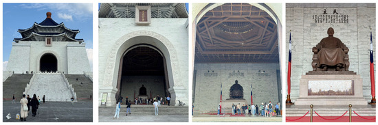 In Taiwan, the CKSMH has evolved from a site of authoritarian glorification to a space of contested historical reinterpretation. Yet, its architecture and visual symbolism continue to reflect the commemorative intent of its original design. As illustrated in Figure 1, spatial elements—such as the elevated staircase, dome ceiling with Kuomintang (KMT) emblem, and a seated bronze statue of Chiang Kai-shek—reinforce ideological centrality and ceremonial order. These elements frame the visitor experience through a structured gaze, shaping emotional and cognitive responses.