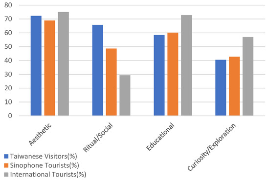 To understand how cultural background influences visitor motivations at the CKSMH, this section analyzes five primary motivation types across Taiwanese, Sinophone, and international tourists. Table 1 summarizes the distribution of selected motivations across groups. A chi-square test was conducted for each motivation to determine whether the observed differences were statistically significant. The results are also visualized in Figure 3, which illustrates the comparative percentages for each motivation type by visitor region, highlighting notable differences—particularly in ritual/social, educational, and curiosity-driven motivations.
