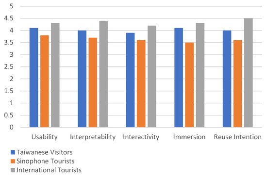 This section evaluates user engagement with digital interpretation tools within the museum context. Grounded in the foundational frameworks of the Technology Acceptance Model (TAM) and the Unified Theory of Acceptance and Use of Technology (UTAUT), the evaluation framework is further enriched by incorporating recent empirical studies that reflect the evolving nature of digital museum experiences. Recent research highlights the critical roles of interactivity, immersion, and perceived presence in shaping user acceptance and satisfaction with digital technologies in museum settings [55,56,57]. Item development was informed by validated instruments from prior studies and adapted to suit the specific context of digital interpretation in museums. Five key constructs were measured using a 5-point Likert scale: (a) Usability (e.g., “The guide was easy to operate”); (b) Interpretability (e.g., “The content helped me understand the exhibition”); (c) Interactivity (e.g., “The interactive features piqued my curiosity”); (d) Immersion (e.g., “I felt immersed in the digital environment”); (e) Intention to reuse (e.g., “I would like to use similar guides in future visits”).
