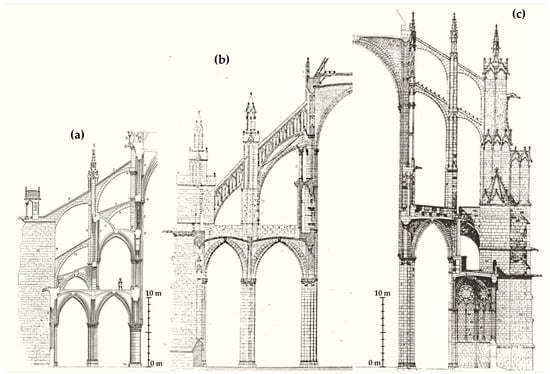 Comparative analysis of the transverse section (nave height and buttressing system) of (a) Notre-Dame Cathedral, Paris; (b) Amiens Cathedral; and (c) Beauvais Cathedral (author’s drawing based on sectional studies by Viollet-le-Duc [2]).