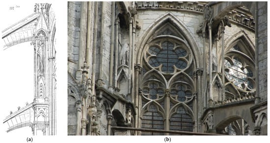 Figure 9. Detail of the buttressing system at the apse of Beauvais Cathedral, in the area where the flying buttresses connect to the main buttresses, shown in (a) a diagram by Viollet-le-Duc [2] and (b) a recent photograph (photograph by the author).