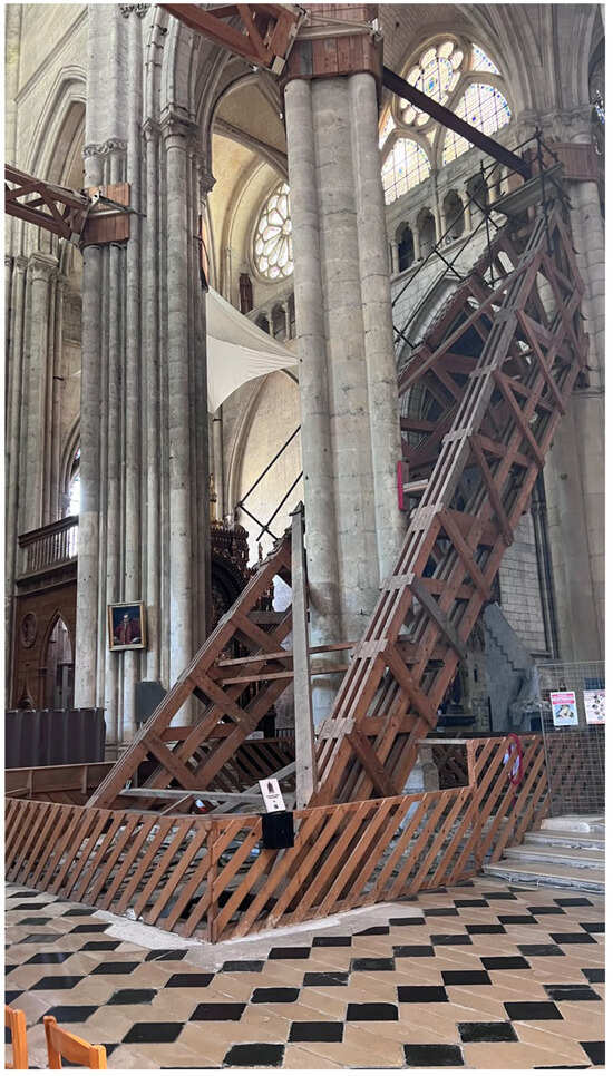 Wooden stabilisation system installed inside Beauvais Cathedral, at the junction of the north transept and the choir nave (photograph by the author).