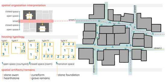 According to Özgüç, the settlement plan of Kaniš, an early example of traditional Anatolian urban planning, is shaped primarily by the street patterns, defined by the surfaces of the buildings and their relationship with the street [48]. The building typology, characterised by rectangular layouts and interconnected rooms, is a dominant feature of the site (Figure 2). These structures, which typically include semi-open passage spaces linked to the street, reflect broader patterns of Anatolian architecture [53]. The internal organisation of these spaces, shaped and reproduced by their users, is crucial in forming urban elements, such as neighbourhoods, squares, and streets. Archaeological findings, including stone ovens, hearths, cuneiform tablets, tomb remains, and stone floor coverings, provide valuable information about the functions of the dwellings. These findings suggest the presence of archives, living spaces, vertical circulation spaces, and shared open courtyards within the residential complexes [48,49].