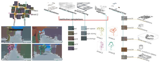 As an urban settlement, understanding the archaeological site’s architectural features—particularly the relationship between squares, streets, common areas, and rooms—can be challenging for visitors. Therefore, the interpretation of spatial functions through these features is critical. In studies conducted in real-world settings [60,61], virtual environments are employed to regulate spatial patterns within the simulation and provide a comprehensive record of user experiences. Based on this potential, a hypothetical virtual environment was developed to interpret the archaeological site’s spatial organisation.