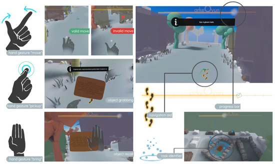 The designed virtual reality gaming experience is integrated with a head-mounted display. The home screen of the developed application consists of a logo, a progress bar, and three separate tabs: game controls, an introduction to the game, and information about the game. The game controls tab teaches users hand gestures such as movement, rotation, and recalling game objects. As Pittera et al. and Ariza et al. emphasise, this guidance is crucial for increasing user interaction in virtual reality environments [71,72]. The controls used throughout the game are defined as three different hand gestures (Figure 4). The game entry tab briefly summarises the game story and allows the game experience to begin with a loading screen. When the player clicks on the tab, they are immersed in the virtual game space. The game space is built on the player’s interaction with visual and auditory stimuli within the game space environment.