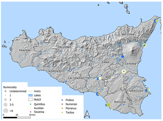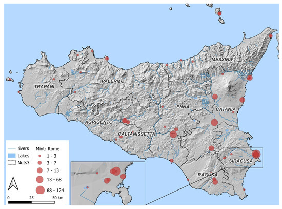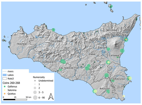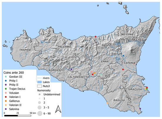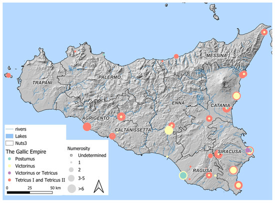 This work is intended to be a preliminary approach toward a broader application of GIS in the territory of Sicily and almost a sort of spur to map the finds on the island in order to have a clearer idea of the monetary distribution at a particular time for the Roman Empire, a period often considered to be in crisis but which for the island shows a very different picture, that of a period characterized by an important movement of men and goods, by an important commercial liveliness, noticeable mainly from the years of the reign of the Tetrici onwards, as demonstrated by the recoveries of imitation coins found all over the island. Important monetary flows would have affected Sicily, a point of passage or even landing on Mediterranean trade routes [25,47,48].