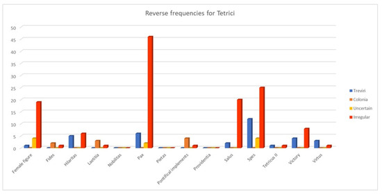 The comparison, by means of a histogram (Figure 7), between the types of the most representative reverses of the Tetrici found on Sicilian territory and issued by the two official mints, Treviri and Colonia (=Cologne), and by irregular mints, provides a more indicative picture of circulation in recent decades of the century. On the island, according to the current state of research and from available data, it would seem that slightly more than half of about 300 antoniniani are imitation coins. This suggests that Sicily may have provided landing points or constituted a transit area for trafficking and vessels from Gaul. A relevant case is the conspicuous number of specimens from the so-called “treasure of the six emperors” found in Camarina (see [30]) not taken in count in the histogram due to his particular specificity. The most representative Reverse’s types of the Gallic usurpers, Pax, Spes and Salus, arrive in far higher percentages than the official issue prototypes (as if to show a precise destination towards this area of the Mediterranean). These types are mostly or almost exclusively imitations of official Tetricus I’s coins struck by the mint of Trier (III–V issues, 272–274 A.D.); it is also noteworthy that the number of barbarous radiates exceeds that of the official coins, as in the case of Pax and Salus.