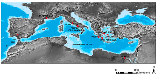 Instead of aiming for an exhaustive coverage of one or two case studies, I sample from a range of recent scholarship to articulate broader lines of inquiry and to provoke further discussions. I focus on the ancient Mediterranean for a few reasons (Figure 1). First, there is a wealth of data from differentiated household contexts as well as, for many historical periods, textual sources that can help contextualize and compare patterns of domestic activity [28]. Household studies have increasingly exposed the heterogeneity of ancient domestic built environments, reminding us that we cannot assume the functionality or makeup of households nor the transhistorical concepts of public/private. Second, advances in paleoenvironmental and paleoclimatic research have made the ancient Mediterranean a particularly robust place to explore premodern human–environment relationships. As a result, there is also a growing literature on ancient climate change in Mediterranean archeology and ancient history and available data from which to draw insights (e.g., [29,30,31]). And finally, the varied environmental and climatic conditions of Mediterranean regions, with millennia-long histories of resource use and landscape manipulation, offer compelling contexts in which to explore the relationality between households and changing ecosystems [32].