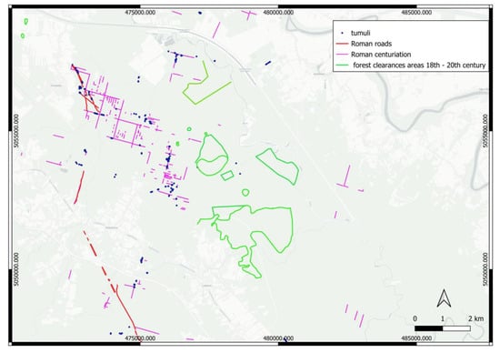 The marked positions of Roman tumuli, roads, and centuriation, and documented historical forest clearance areas (base: QGIS; Carto Light).