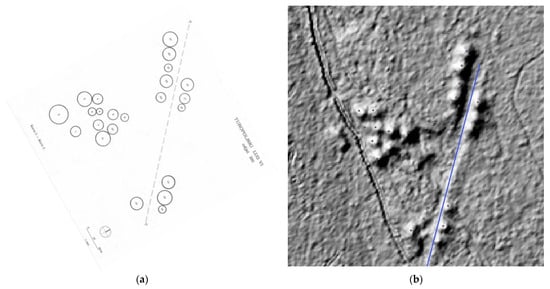 Tumuli and centuriation in Turopoljski Lug: (a) sketch by Gregl [6]; (b) hillshade visualization (35° zenith angle, 315° azimuth). Blue line (b) is a centuriation limites.