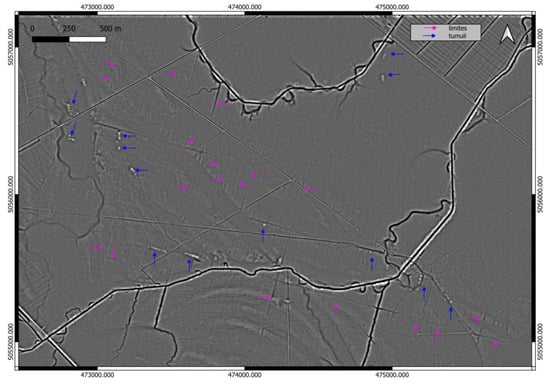 Z. Gregl [6] noted the regular concertation of tumuli group VI in parallel lines and mentioned the possibility that they were aligned alongside the road, but that could not be confirmed (Figure 4a). The space between groups he observed was a centuriation line (Figure 4b). On LIDAR data, we recognized 389 tumuli in 32 zones (Table 1 and Figure 5).