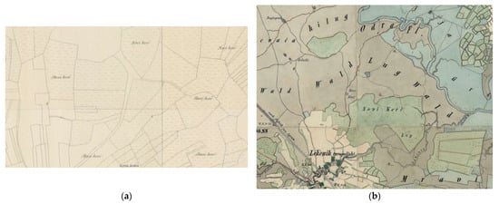 During the 18th century, extensive forest clearing was undertaken and the land was transformed into arable fields, which is documented by written records, plans, and topographical names. The biggest one happened in the second half of the 18th century, when organized deforestation took place and the new land was equally divided among Turopolje nobility [37]. It lasted from 1776 to 1779, and as a reminder of this significant event, a memorial gate was erected—Vrata od krča (Deforestation Gate). The gate was destroyed and restored several times and is now a protected monument [9]. The clearance areas are often recognizable by the toponym KRČ (Croatian word for clearing forest/bushes to transform forest into arable fields and also toponyms Krčevina or Kerč/ć are present on historical map) [32,33]. Historical maps prove that the areas where centuriation lines are not visible at the moment are areas where deliberate deforestation and clearance took place during the 18th, 19th, and 20th centuries (Figure 2 and Figure 7). Some are near modern villages like Buševac, Lekenik on east Krči, Poljana on east Krčevina, west from Suša Kerči, and Kerčinci (all on Habsburg Empire—Cadastral maps (XIX century)) (Figure 7a) [32]. On the First Military Survey (1783–1784) Provinz Kroatien map, west from Veleševac is the toponym Kerchevina (Figure 7b) [32]. On the modern map Krči Geoportal, the same toponym is in the vicinity of the village Ogulinec [33].