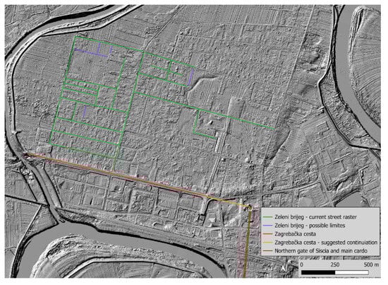 The azimuth of centuriation is 15 degrees. It is worth mentioning that the streets of present day Sisak in its northern part (Zeleni brijeg), outside of the Roman town perimeter, have the same orientation, while the street grid in the part of the town that was Roman Siscia has a different orientation. We can conclude that this block of land division was finalized at the northern entrance to Roman Siscia. The existing Zagrebačka cesta entering Sisak from the west Siscia follows that azimuth, as well as the Zeleni brijeg part of the town (Figure 8). On LIDAR visualization, there are some visible features that could present the remains of limites since they are not part of present streets and blocks.